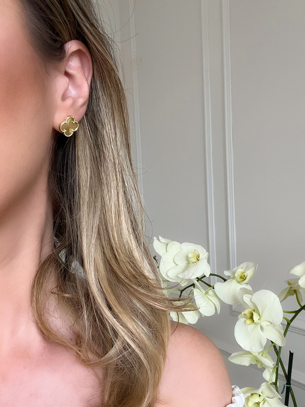 Trevo em metal texturizado banhado a ouro 18k, produzido com materiais nobres e hipoalergênico.