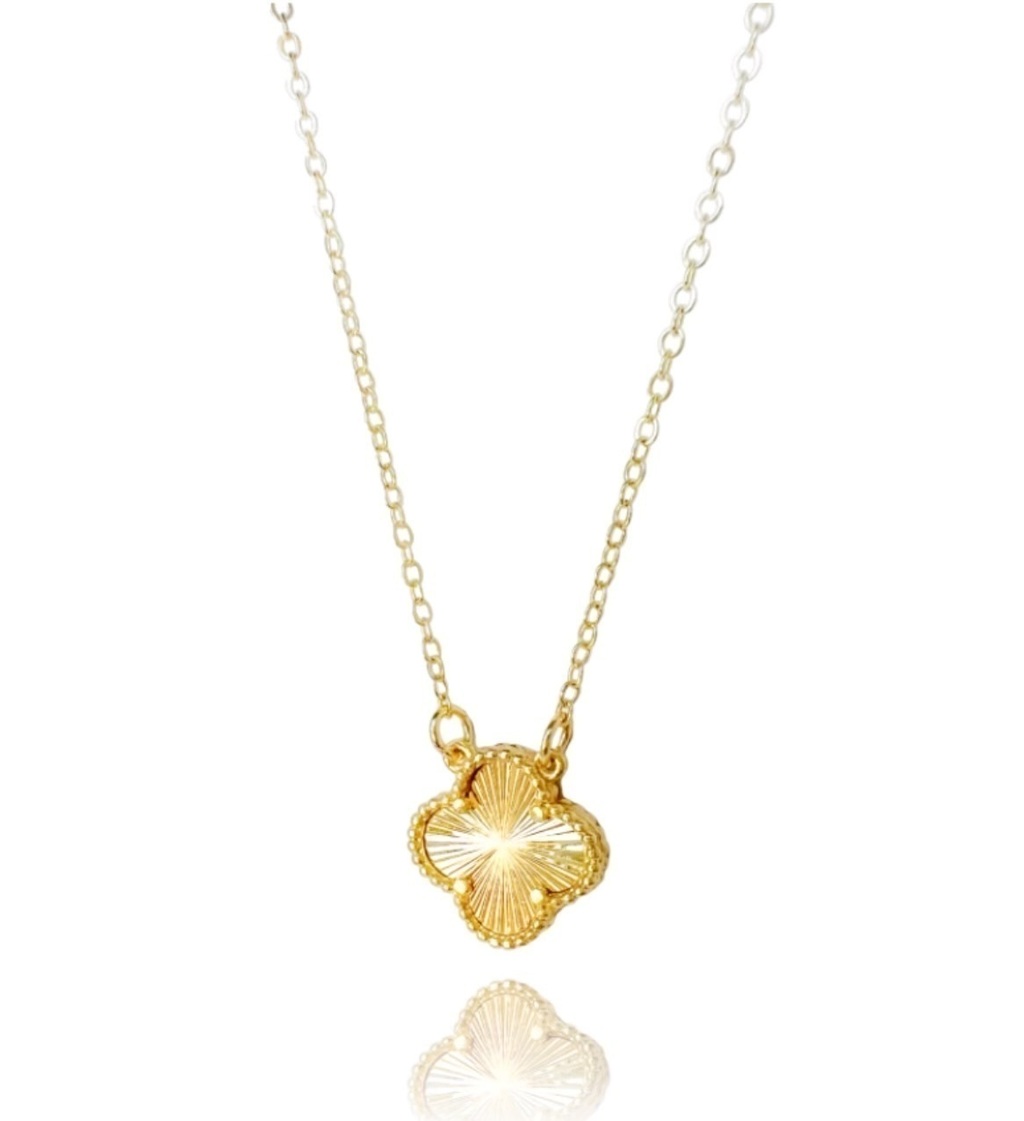 Trevo trabalhado em metal texturizado, com borda de mini esferas nos dois lados. Peça banhada a ouro 18k, produzido com materiais nobres e hipoalergênico.
